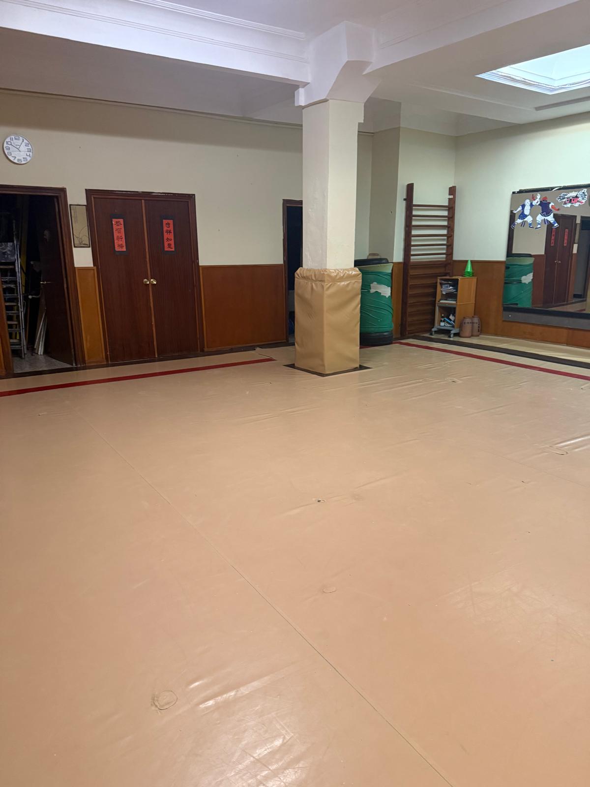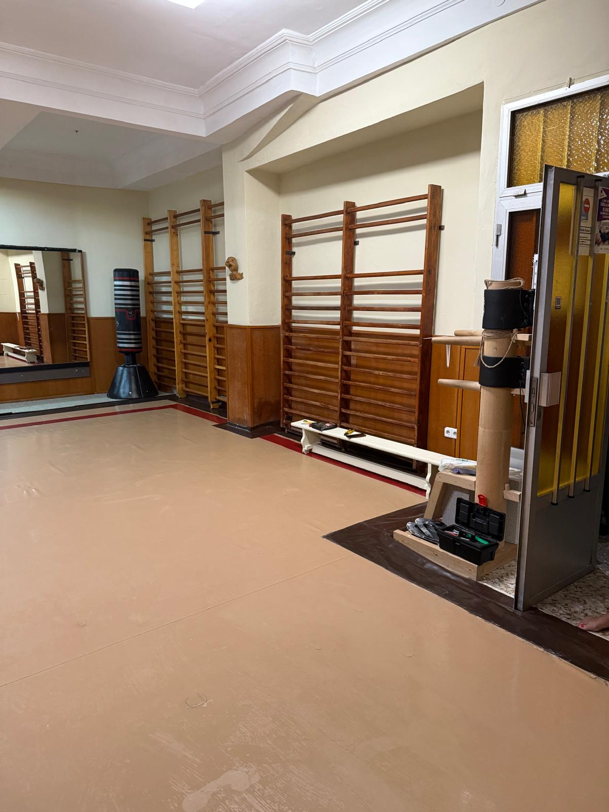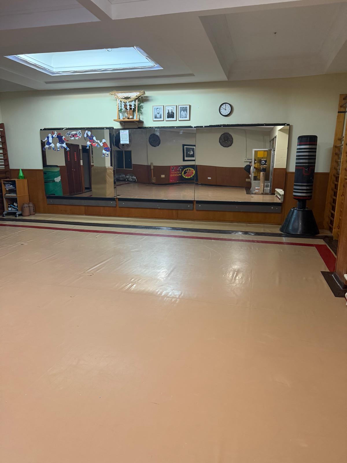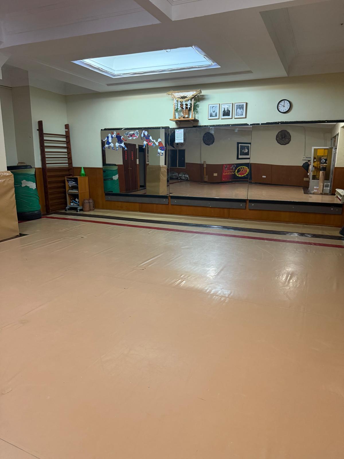 Equipada con suelo acolchado de tatami tradicional  con espejos, espalderas, reproductor de música,  aparatos de gimnasia y acrobáticos. Para hacer mas amenas tus clases.